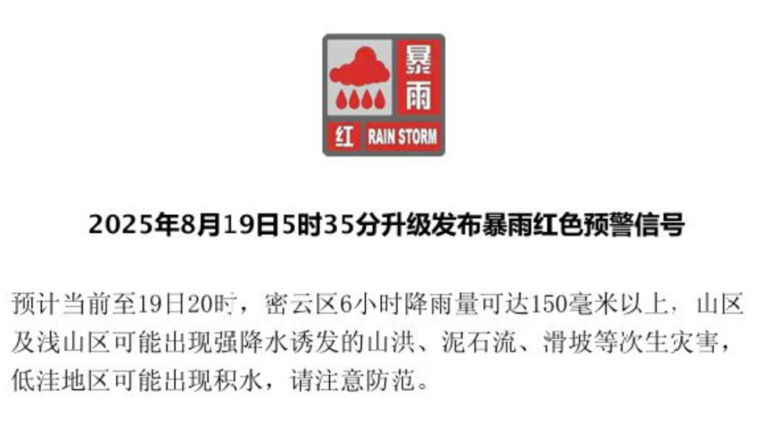线上配资公司 19日5时35分,怀柔区发布暴雨红色预警,启动防汛一级应急响应